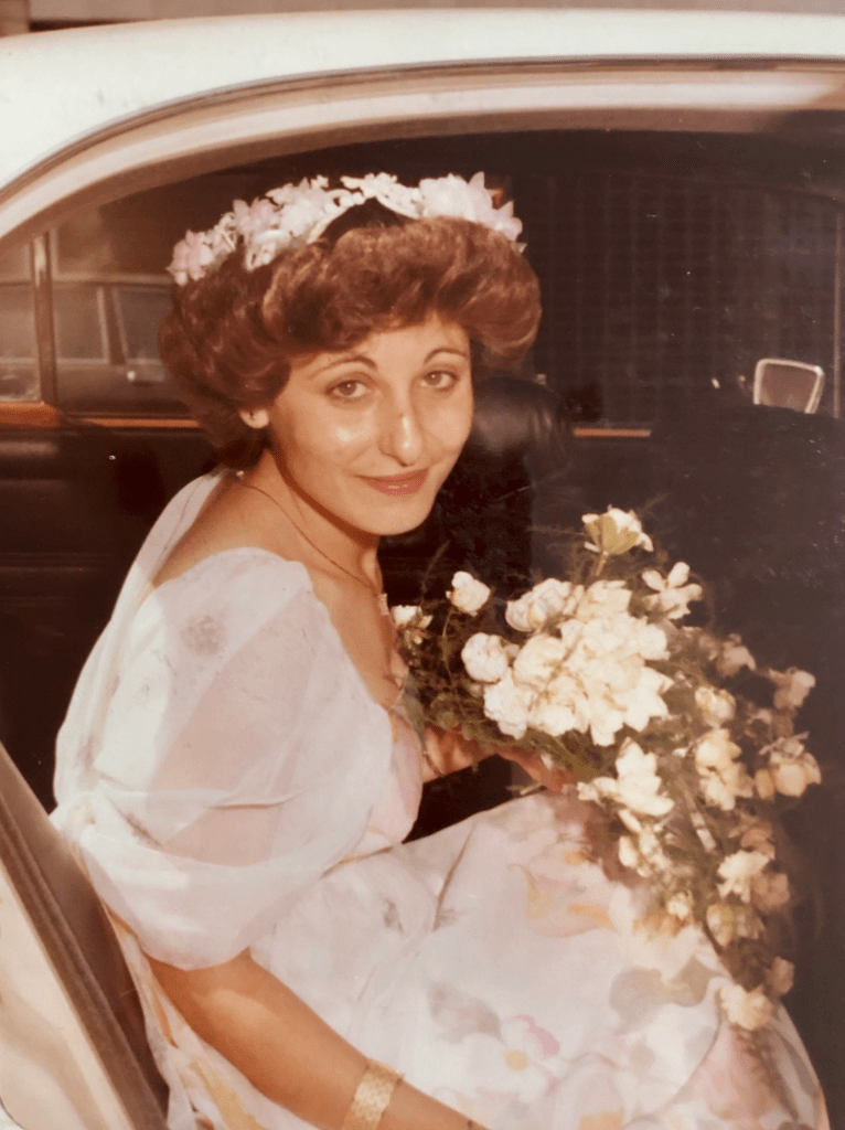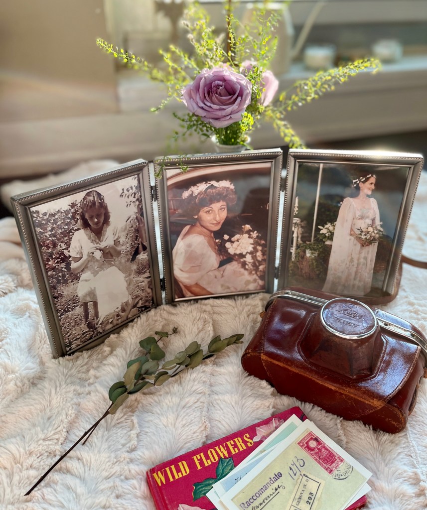Photographs of my young Grandmother doing needlework in a sunny garden, my young Mother on her wedding day surrounded by fresh gardenias, and me on my wedding day in front of a wall of cedar trees, wearing her dress.