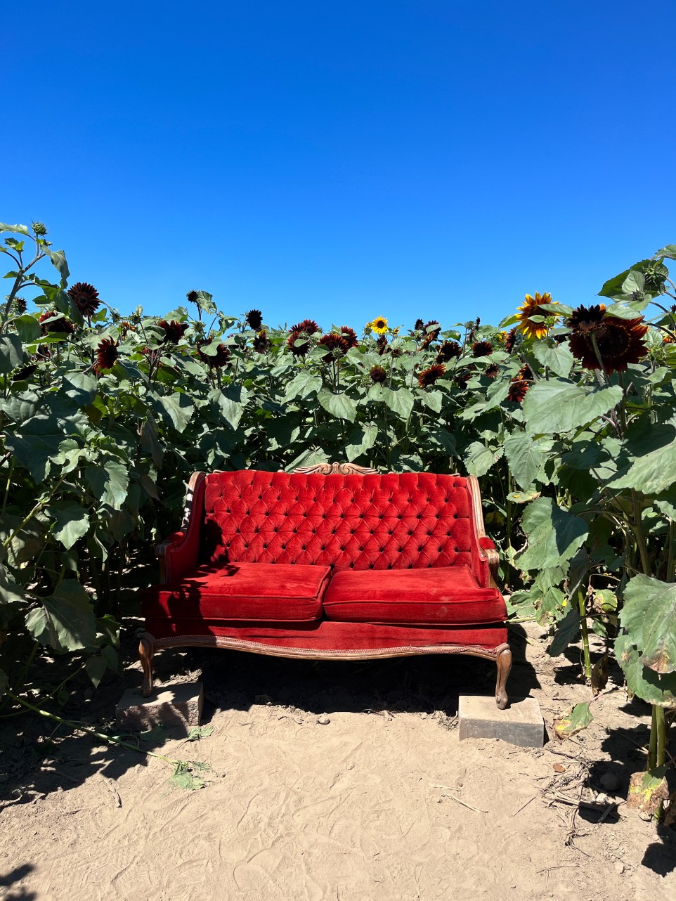 And in getting lost, I found red velvet sunflowers and a matching red velvet couch. I also found white sunflowers and white lace hanging in the sun. I have never seen red or white sunflowers before.