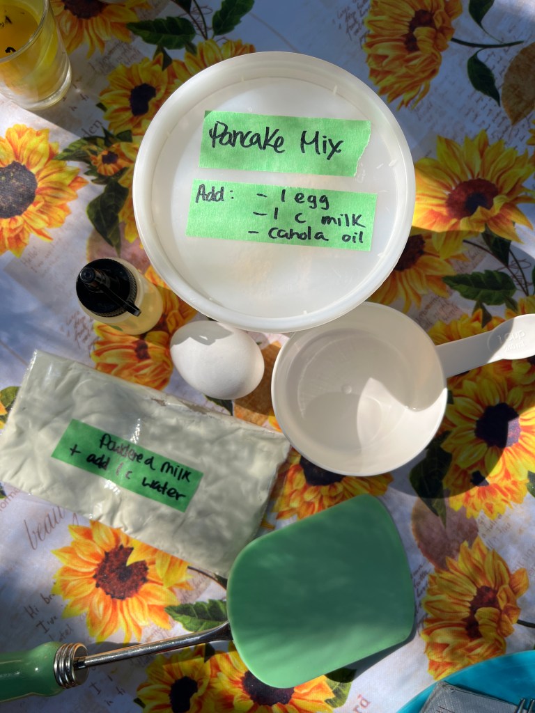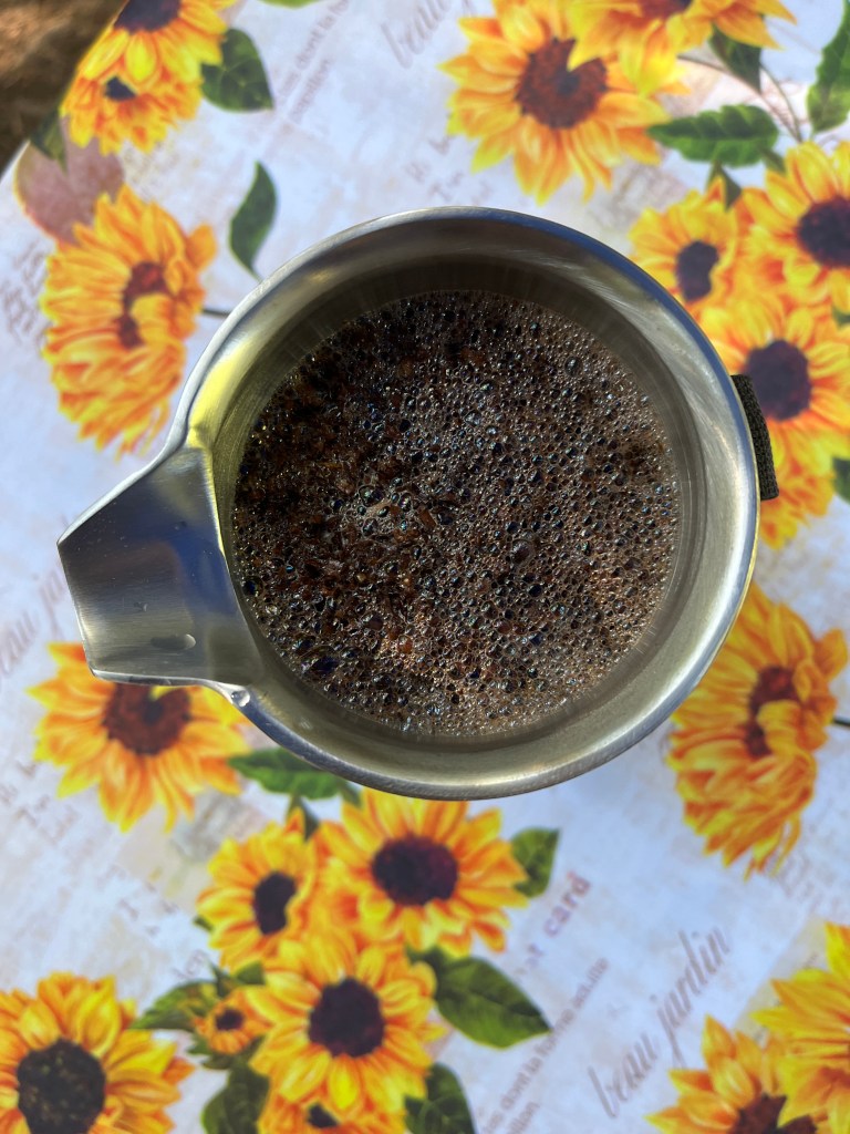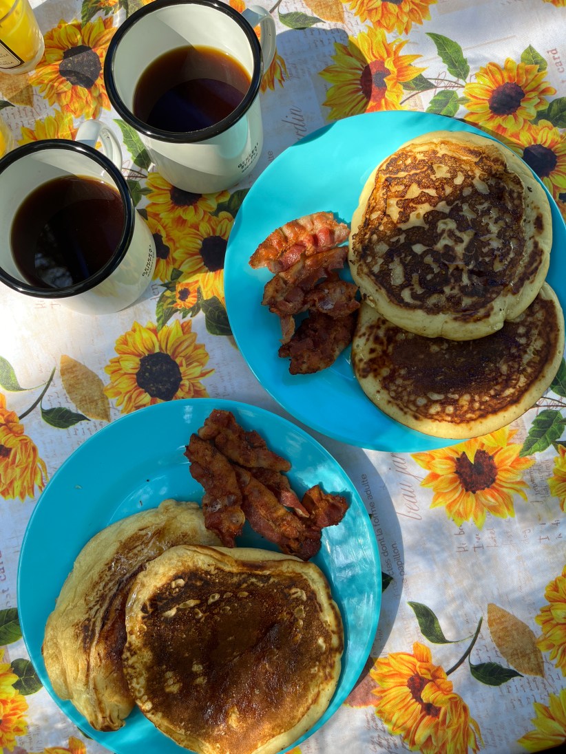 The sun beaming on our yellow tent after a morning rainfall, the aroma and sound of sizzling bacon, the aroma of fresh coffee, the view from our outdoor kitchen nook, pancakes.