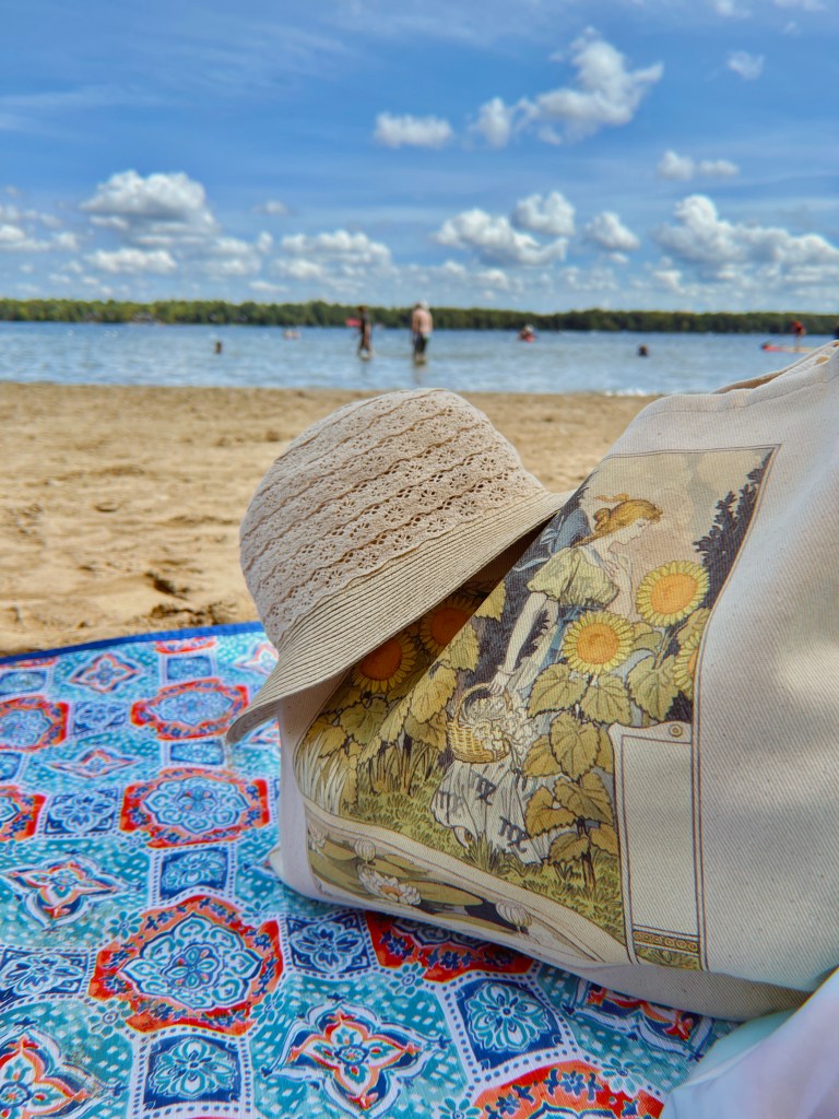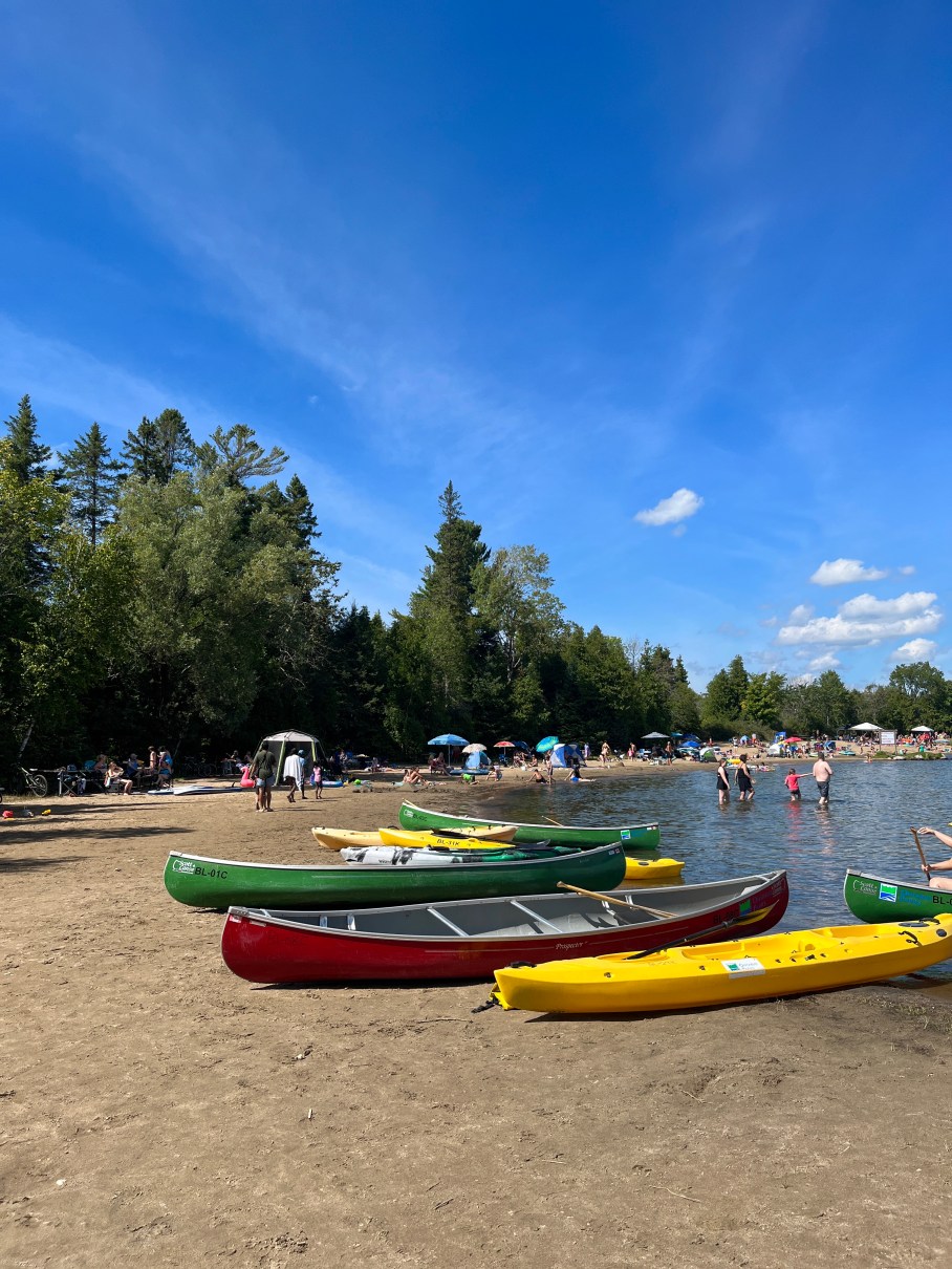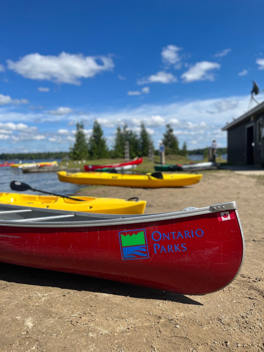 A tote bag full full of towels, books and snacks, and the colourful lineup of canoes along the shore of beautiful Balsam Lake.