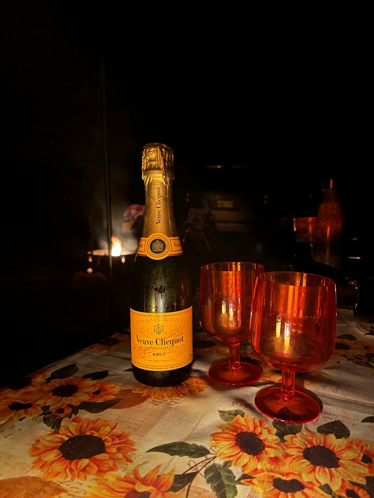 We packed up our yellow tent and a bottle of champagne, and away we went.