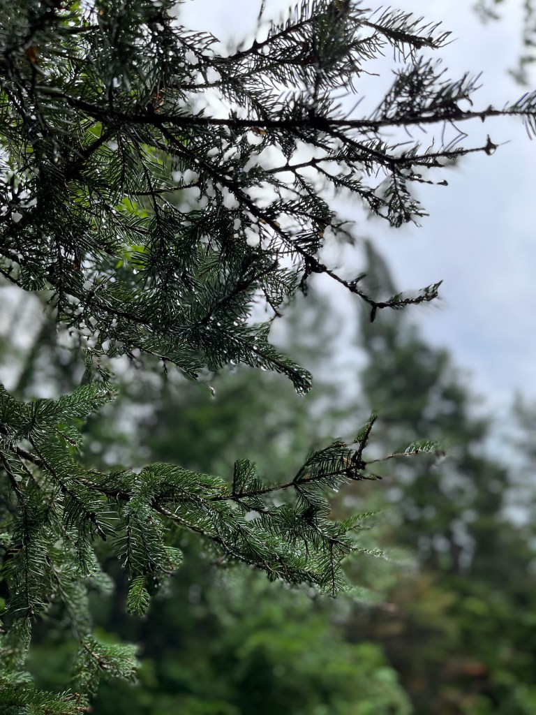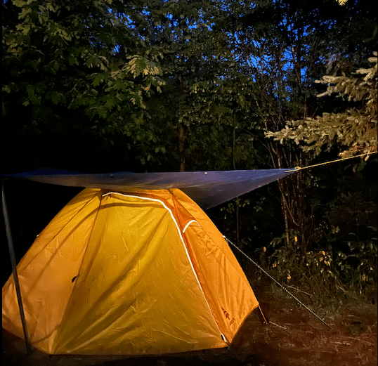 Therapeutic sounds of rain landing on our tarp while sheltered safely in a glowing yellow tent, flipping through pages of books barely touched, and the smell of rain droplets on evergreens after the storm has passed.