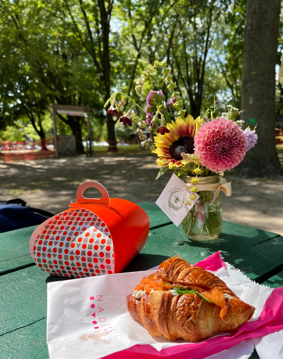 Eventually, our appetite led us to a nearby French bakery where we enjoyed croissants and pain au chocolat, and an unintentional picnic table centrepiece of dahlias and sunflowers.