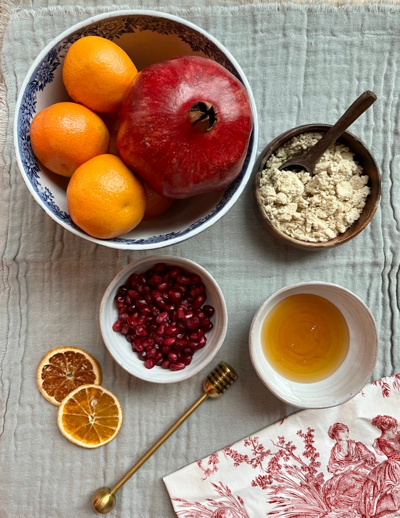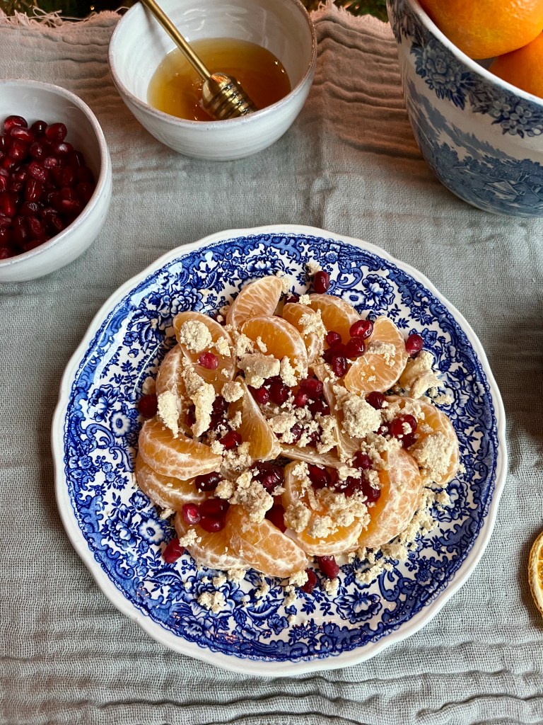 The creamy vanilla flavour of the halva tastes so silky when paired with the tart and citrusy burst of the crispy pomegranate seeds, the clementines and sweetness of the honey. It is such a bright and seasonal treat.