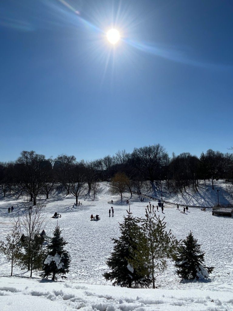 The crystals from the untouched snow glistened like icy sparkles below the mid-morning sky. Dogs ran freely into the cushiony open space, snowpeople were scattered throughout the park, and kids and adults alike gathered at the top of the hill with their toboggans.