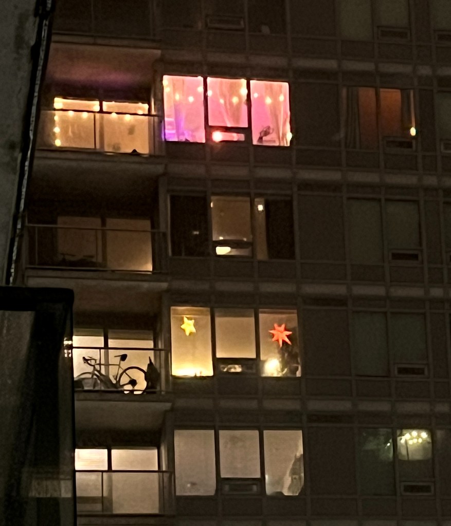 Starry lights were glowing from multiple windows across from us. A few particularly caught my eye. The cluster of pink and orange glows framed by twinkle lights. Below it, a yellow and red star luminously dangled from another window.