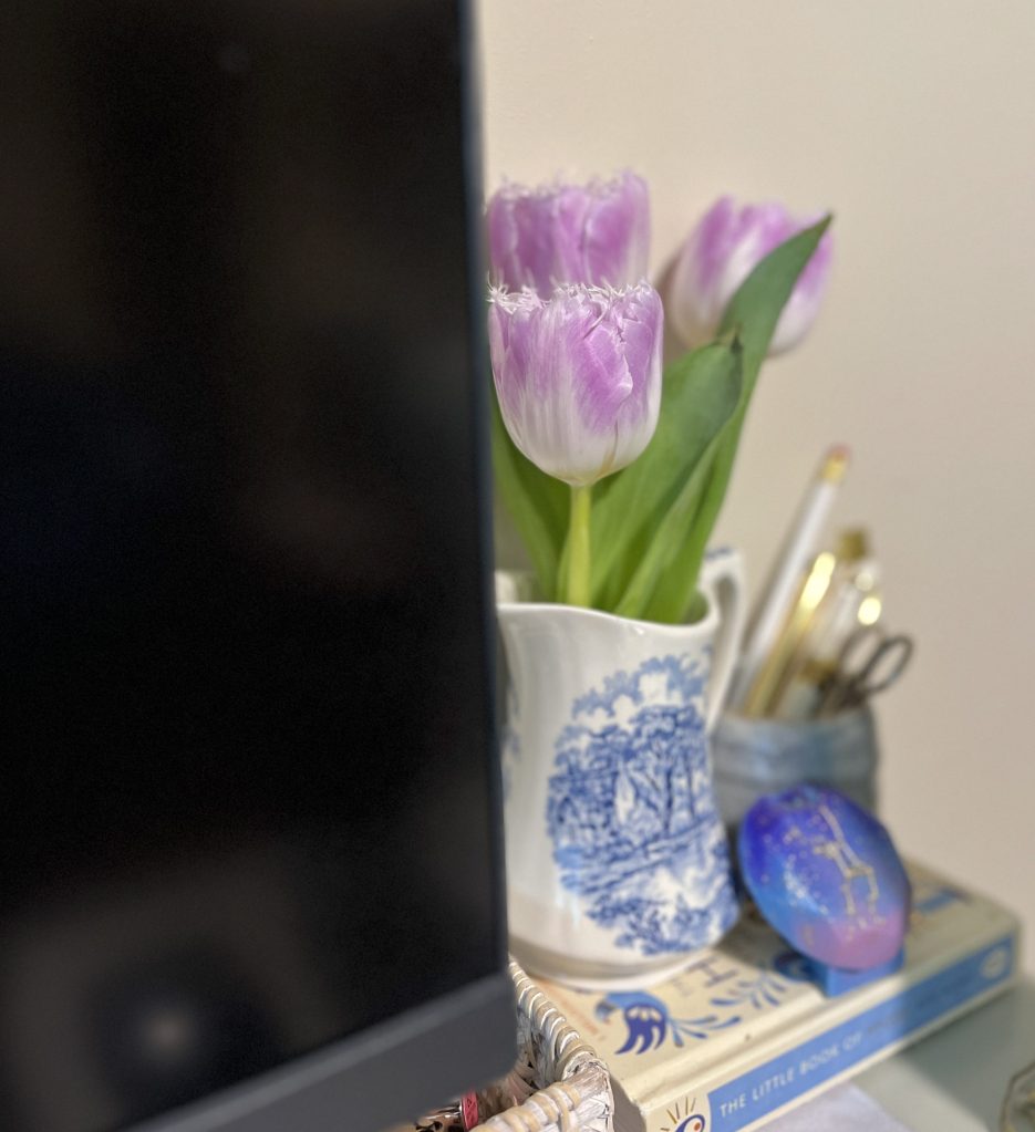 A whimsical delivery that looked like a painting. A dreamy arrangement of white tulips, velveteen ranunculus, pink snap dragons and chrysanthemum pom poms. The only things missing from this view was a paint brush.