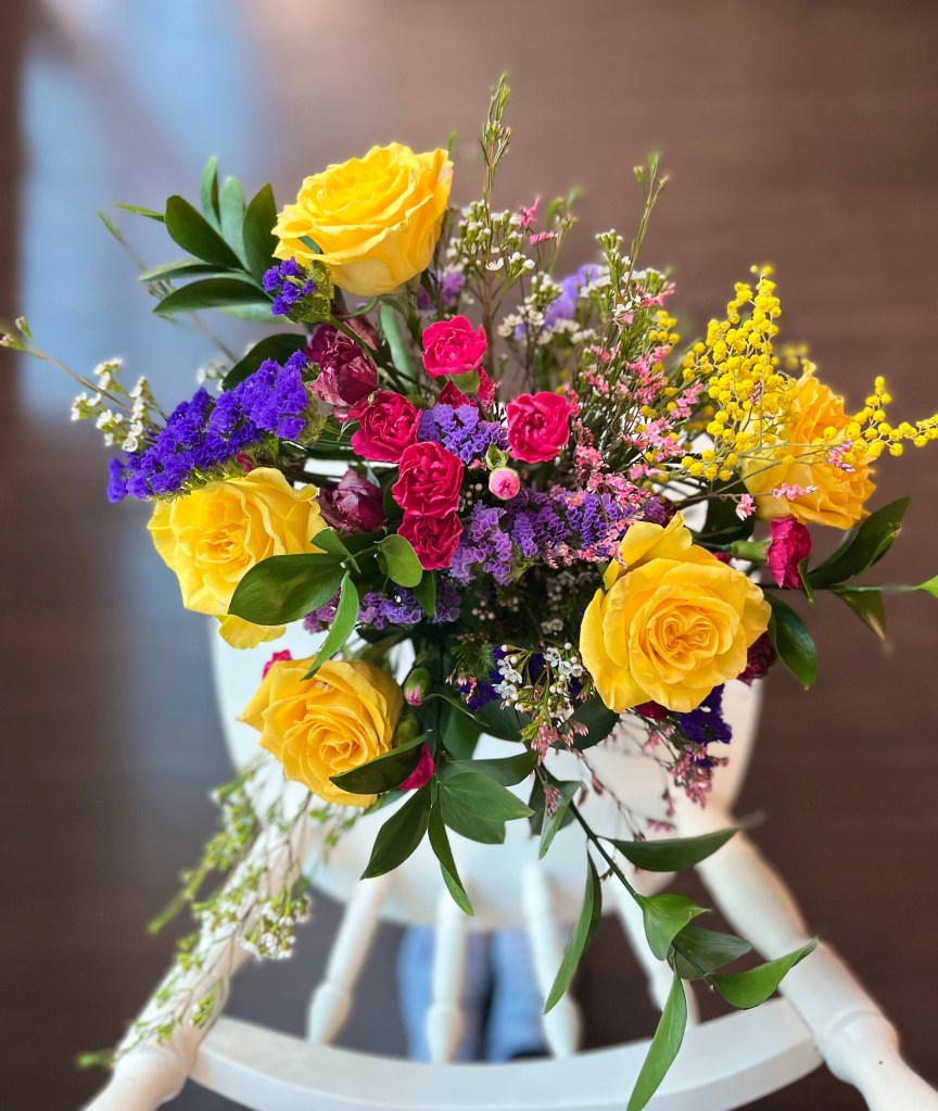 A bright summer garden nestled in a Moroccan vase. Yellow roses, bold fuchsias and purples with a touch of delicate little daisies to balance it all out. My favourite item in that arrangement: a playful branch of tiny yellow mimosa flowers.