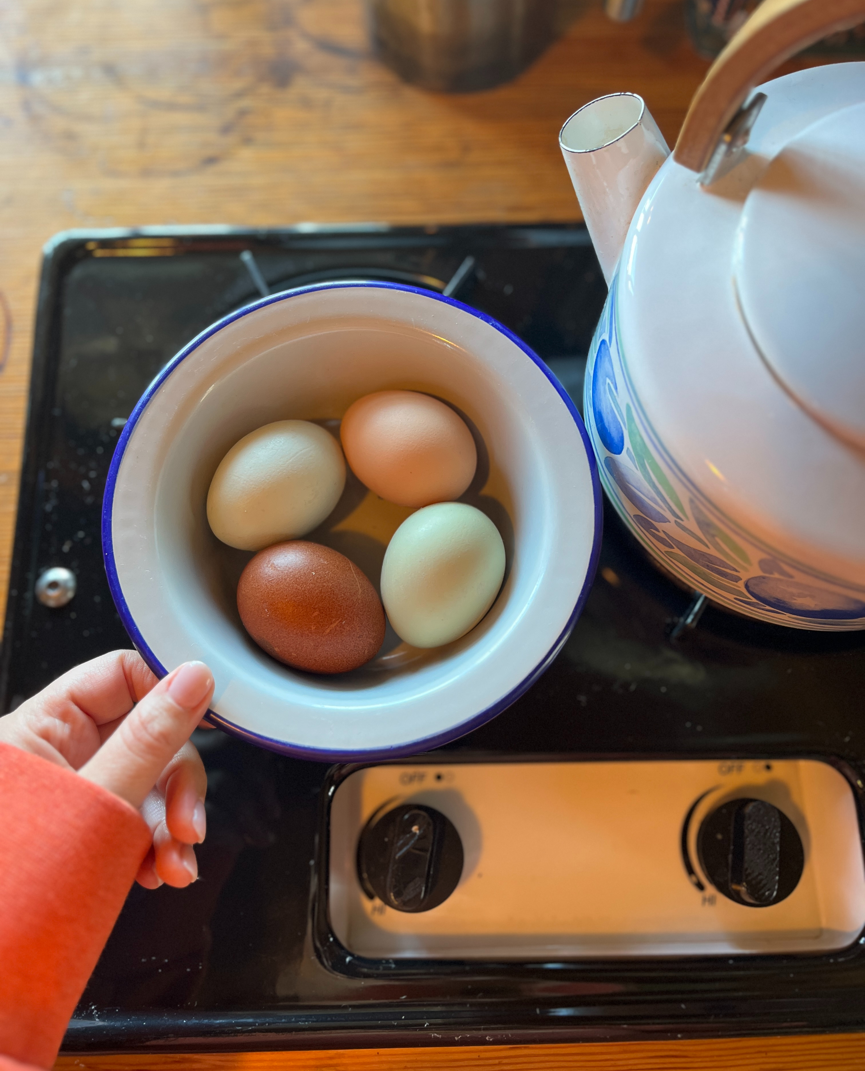 The mornings at the cabin were my favourite. The 7am sun rose in front of the kitchen window and spilled inside when the quilted curtain was drawn. The air was crisp, water boiled on the gas stove, and pages of a novel were flipped slowly. I was truly invested in the characters’ stories this time, not being distracted by pings or to-do lists. We made breakfast sandwiches using our gifted eggs, and enjoyed our breakfast unhurried with the radio playing inside and birdsong echoing outside.