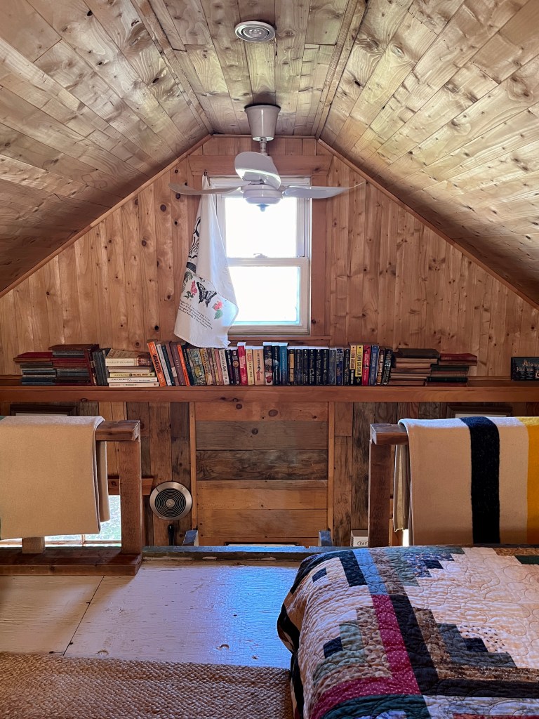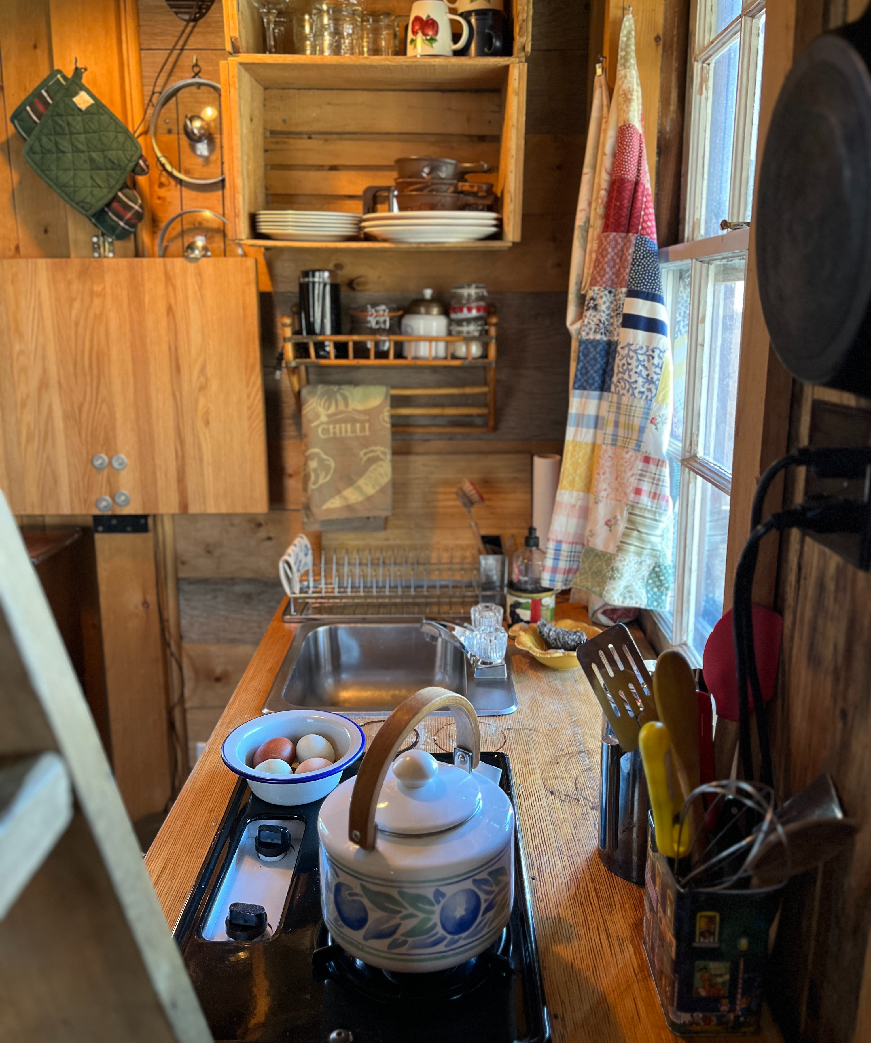 Welcomed warmly by our smiling host, she spoiled us with farm fresh eggs and homemade raisin bread. Everything had its place in this tiny home: a vintage radio, string lights above the fireplace, a bouquet of strawflowers placed on the entranceway shelf, a wooden crate repurposed as a coffee table, a collection of books sitting beneath a swaying curtain. We were surrounded by trees, a symphony of birds, chickens and curious neighbourly cats who dropped by multiple times to say hello.