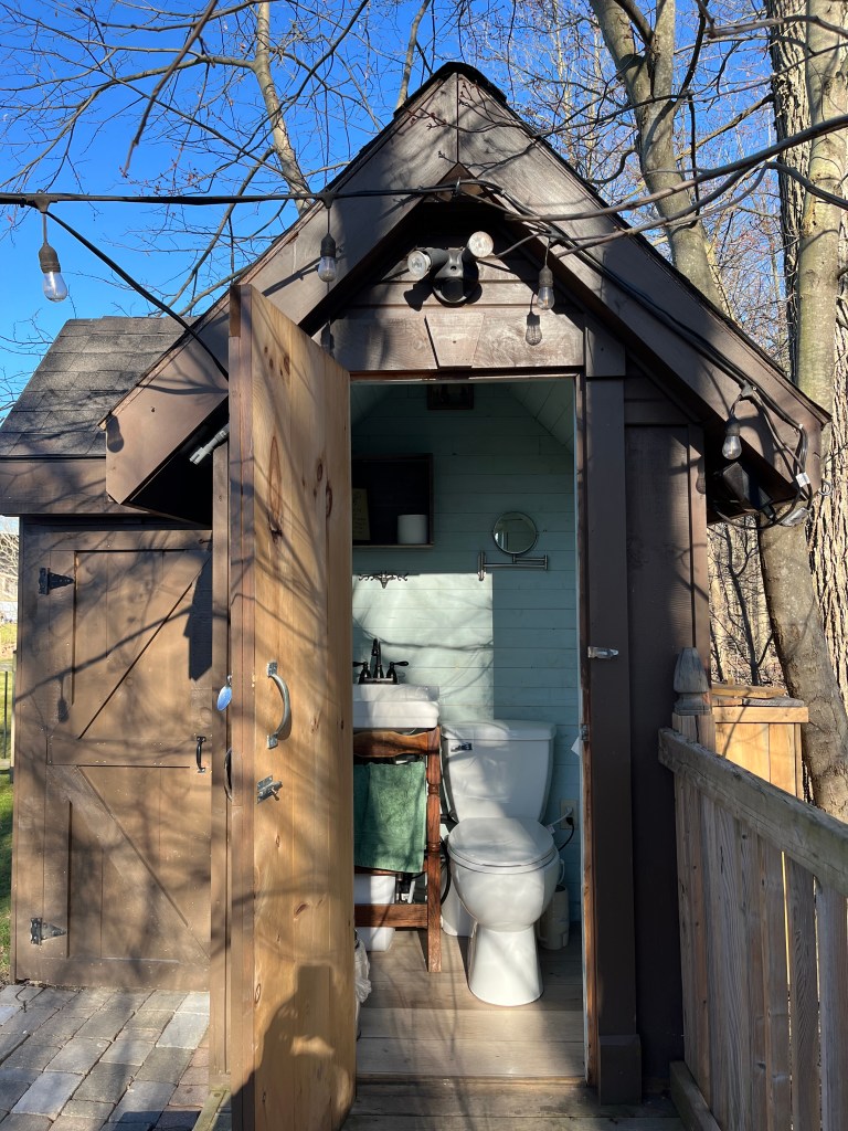The skylight in the shower added an unexpected touch of luxury in such a rustic setting. Every morning, with frost on the ground, I’d run over to the outhouse and warm up immediately under warm soapy water while looking above at the blue sky. Clean towels, soap and shampoo were conveniently available. Dressed up and refreshed, I would step outside and brush my teeth with the outhouse door open, welcoming reflections of the sun glare on the vanity mirror and birdsong behind me.