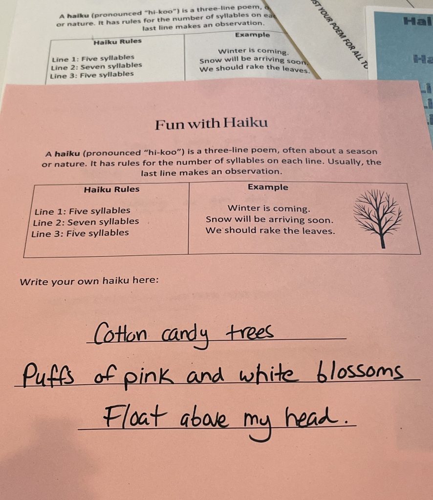 - Participating in haiku writing at the Sakura exhibit in the middle of the week